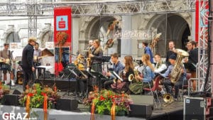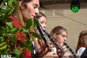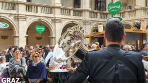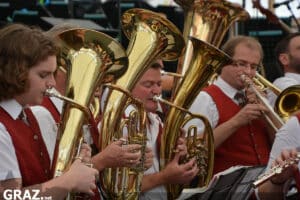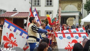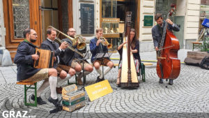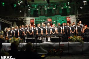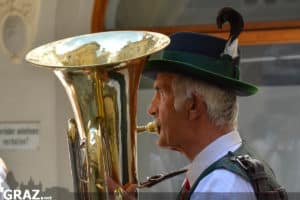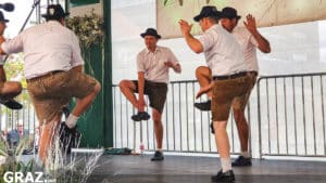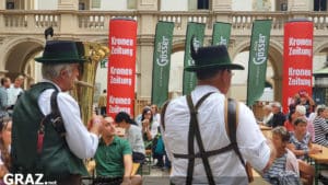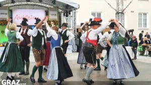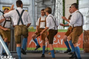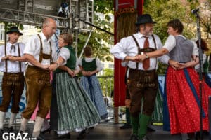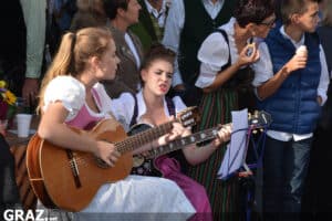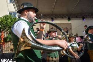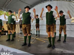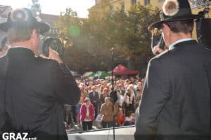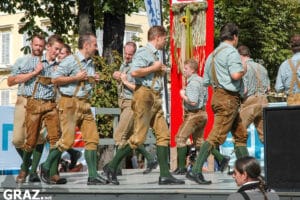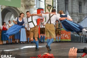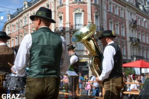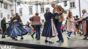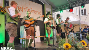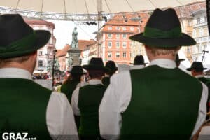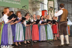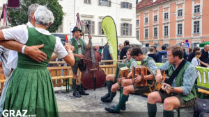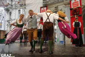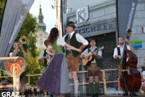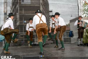 Am Sonntag hieß es Aufsteirern – zwar war das Wetter in der Früh nicht allzu toll, am Nachmittag kam aber die Sonne raus. Allen Ecken, Gassen und Plätze verwandelten sich zu Bühnen und Schauplätzen steirischer Volkskultur. Musikanten spielen auf und die Volkstänzer drehen ihre Runden zur Musik.