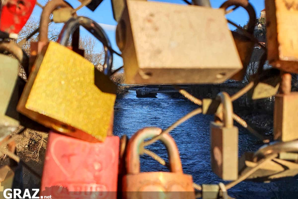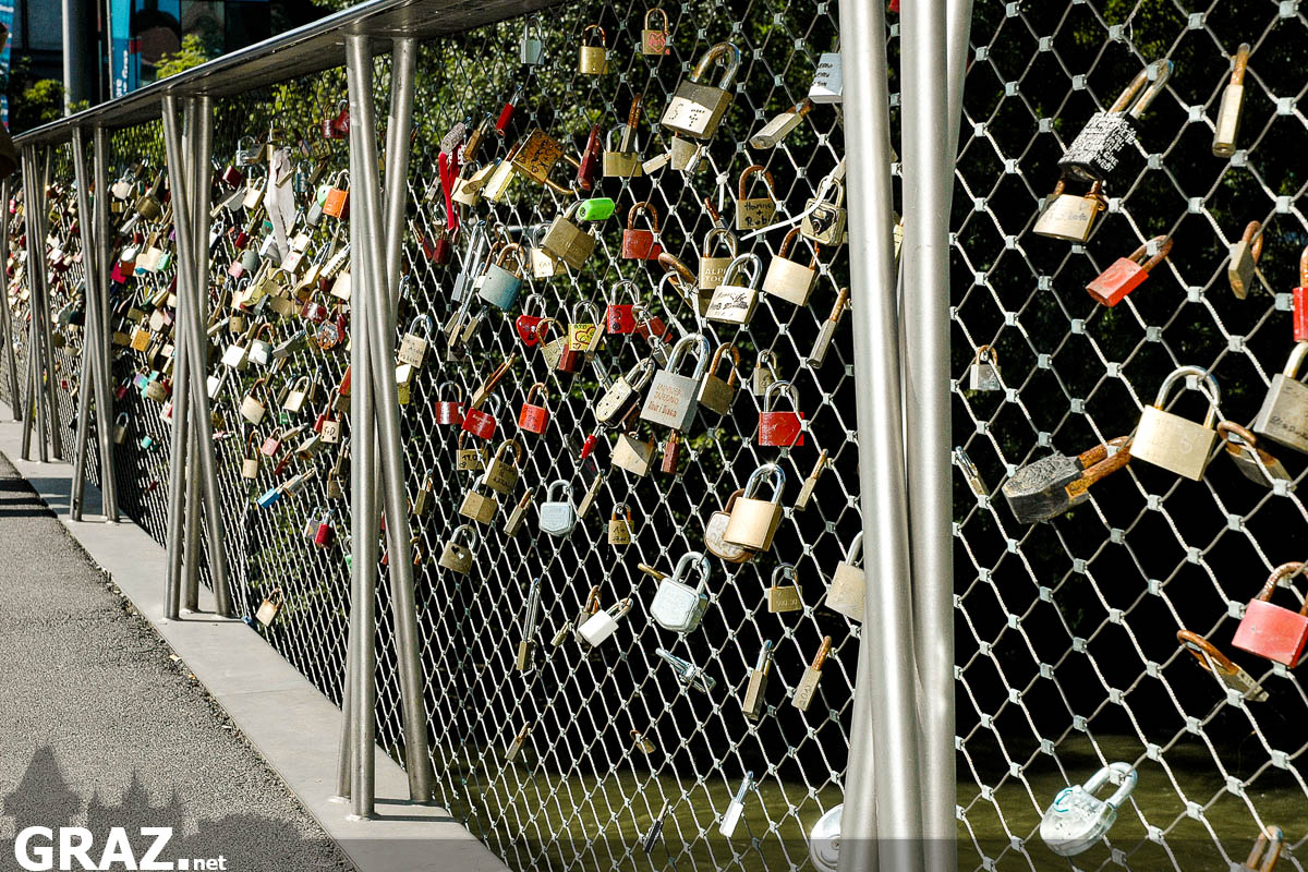 Die Erzherzog-Johann-Brücke (ehemalige Hauptbrücke), die den westlichen mit dem östlichen Teil von Graz verbindet, beweist vor allem eins: Es gibt sie in Graz, die große Liebe. Denn die Brückengeländer sind ewiger Zeuge davon. Sie hängen voll mit „Liebesschlössern“ verschiedener Pärchen. Sie haben hier ihr eigenes, oft mit Initialen oder Namen versehenes Schloss, zu den unzähligen anderen gehängt.