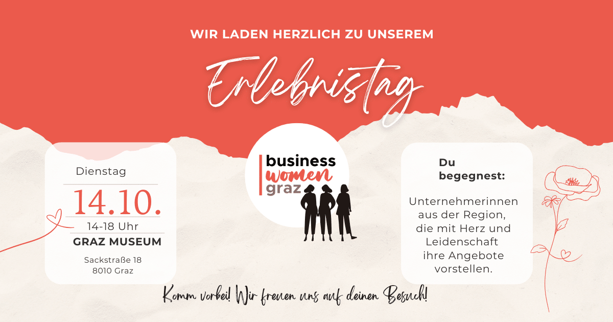 Der Erlebnismarkt lädt Besucher:innen zu einem offenen Entdeckungsrundgang ein: „Business Women“ aus unterschiedlichen Bereichen stellen ihre Arbeit und Produkte vor – von Körperarbeit und Persönlichkeitsentwicklung über Coaching bis hin zu Naturprodukten, Schmuckdesign sowie Themen rund um Steuer und Finanzen. Der Eintritt ist frei.