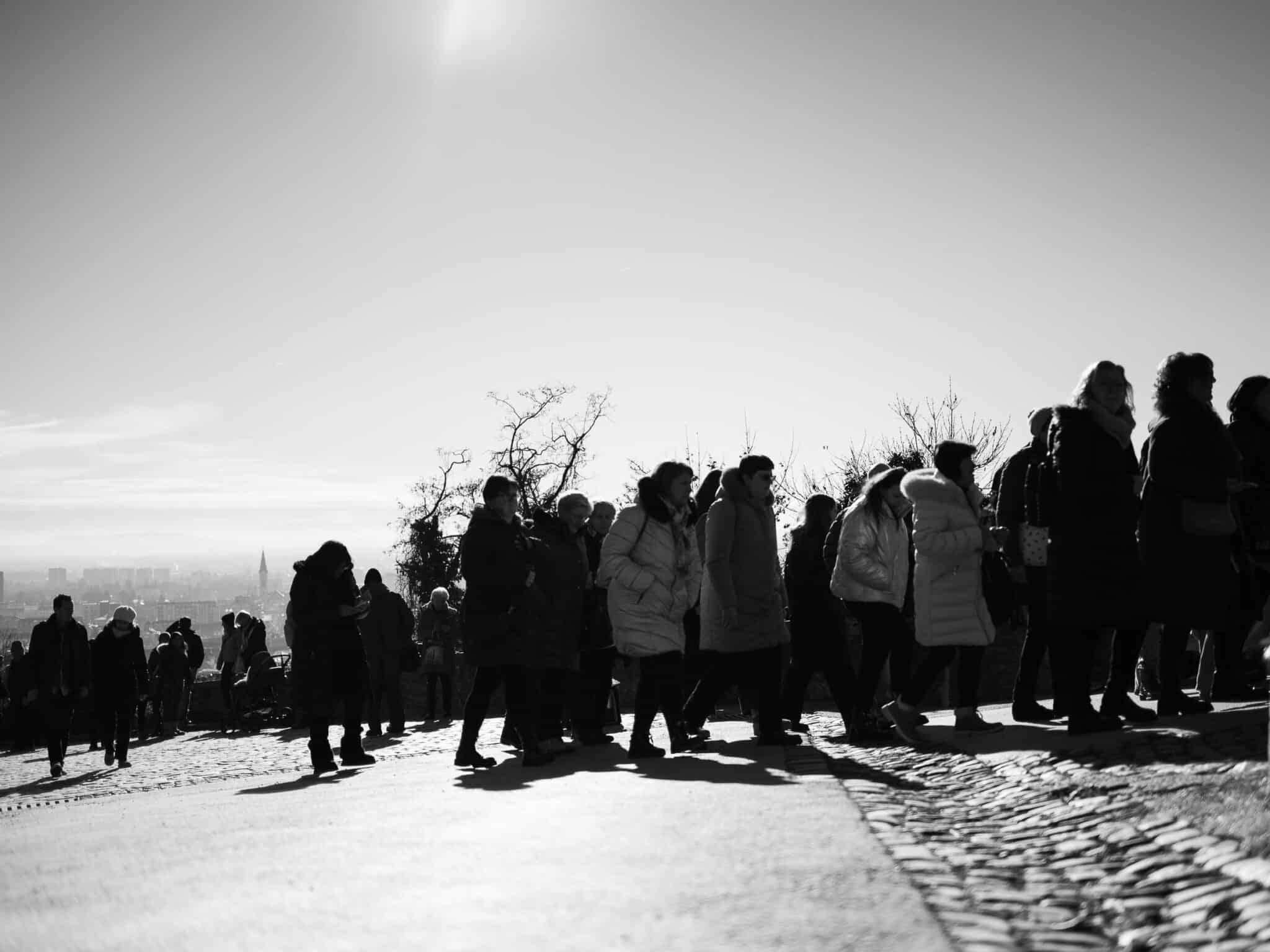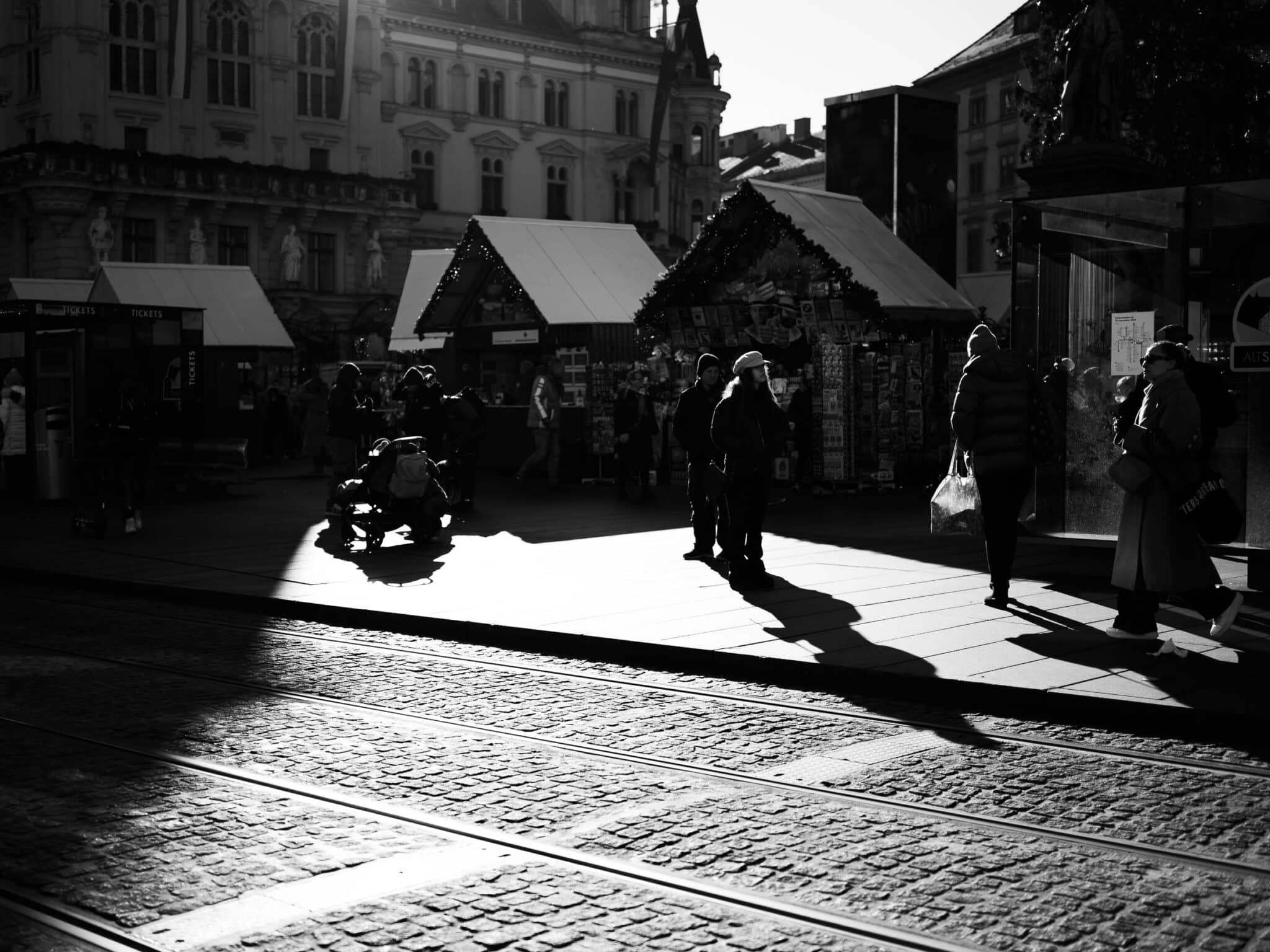 Der erste Adventsamstag in der Grazer Innenstadt zeigt sich hier nicht als Postkartenmotiv, sondern als Sammlung dichter, stiller Augenblicke. In reduzierten Schwarzweiß-Bildern fängt die Serie den Wechsel von Licht und Schatten, die Eile und das Innehalten auf Gehsteigen, in Straßenbahnen und vor Schaufenstern ein. Bewegung, Silhouetten im Gegenlicht und flüchtige Begegnungen erzählen von einer Stadt, die zwischen Vorfreude und Alltagsrhythmus oszilliert. Diese Galerie lädt dazu ein, genauer hinzusehen: auf Linien, Texturen und auf die kleinen Rituale, die den Advent hier beginnen lassen.