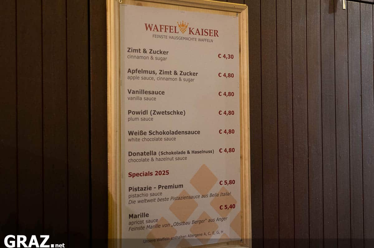 Am Hauptplatz gibt’s zum Beispiel Ofenkartoffeln in unterschiedlichen Varianten – von der einfachen Version mit Bio-Bauernbutter um etwa 5,50 Euro bis hin zur Ofenkartoffel mit Crispy Chicken oder Bratwürstl um rund 9,50 Euro. Dazu passend sind auch Raclette-Varianten im Angebot, deren Duft über den halben Markt strömt: „Raclette auf Ciabatta“ wird um etwa 7 Euro serviert, wahlweise mit Ananas-Curry oder Prosciutto. Waffeln gibt’s ab 4,30 Euro. Ergänzt wird das Ganze durch die typischen Klassiker wie Langos, Würstel, süße Bäckereien, gebrannte Mandeln oder Schokofrüchte, deren Preise je nach Stand variieren, sich insgesamt aber im bekannten Rahmen der vergangenen Jahre bewegen.