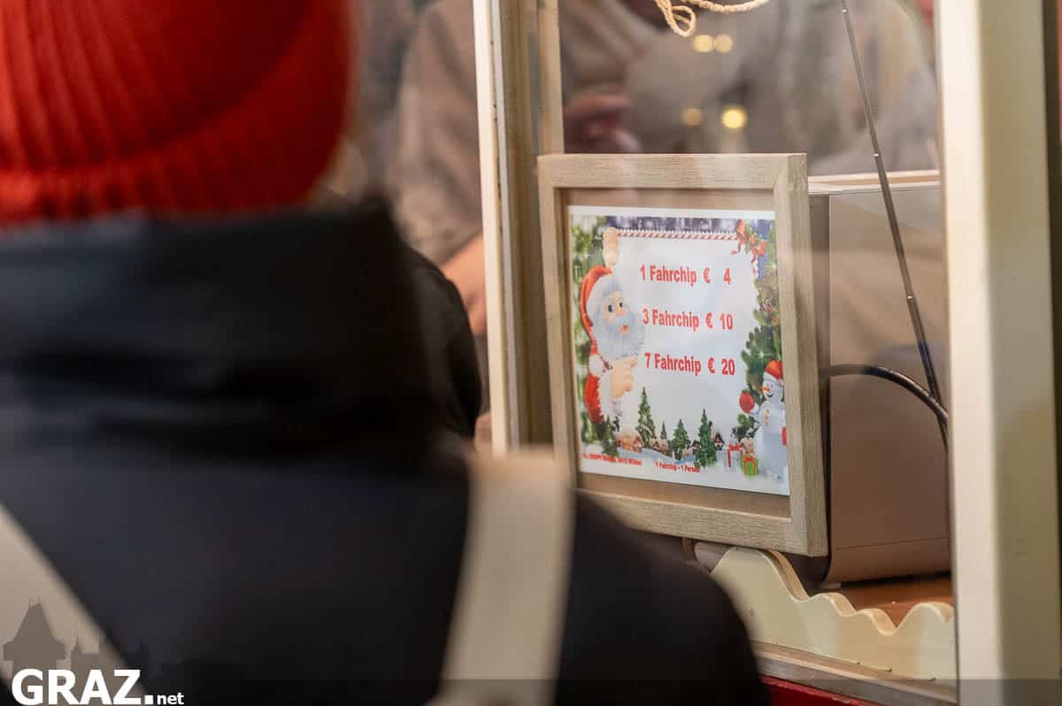 Neben dem Karussell ist auch der Bummelzug ein Fixpunkt für viele Familien. Wer hier mitfährt, zahlt bis zum 12. Lebensjahr rund 2 Euro pro Fahrt, Erwachsene liegen bei etwa 3 Euro. Die beleuchtete Advent-Bim ist an den Wochenenden unterwegs und kann gegen eine freiwillige Spende genutzt werden.