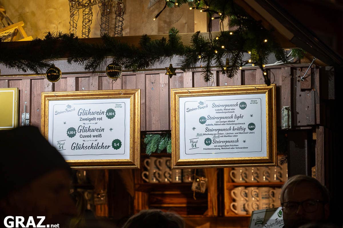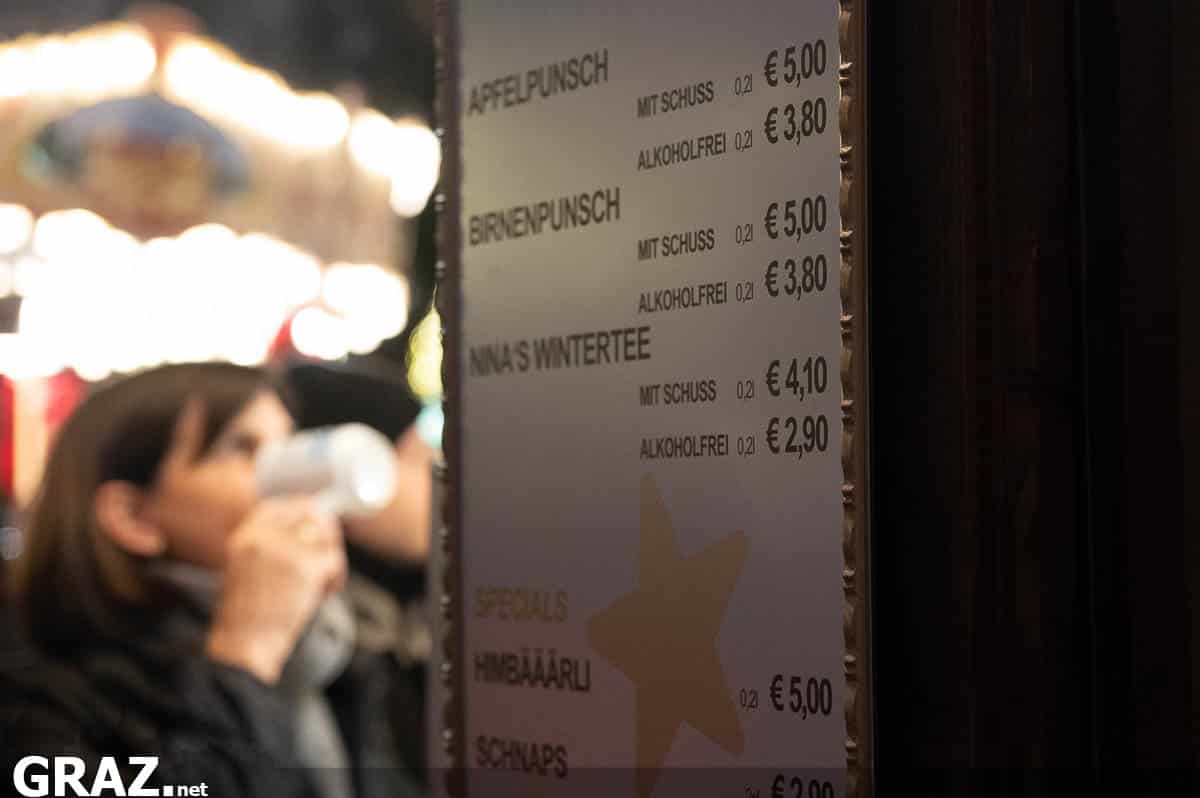 Wie gewohnt wird bei fast allen Ständen zusätzlich Pfand um die 5 Euro fürs Häferl verrechnet, das beim Zurückgeben refundiert wird. Alkoholfreie Varianten wie Kinderpunsch, Tee oder Kakao sind in der Regel etwas günstiger, genaue Preise schwanken aber je nach Platz und Stand.
