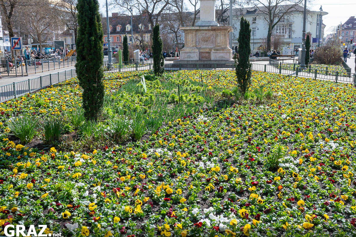 Rund um die Mariensäule entsteht auf etwa 270 Quadratmetern eine der größten saisonalen Blumenflächen der Stadt. Die Muster und Farbkompositionen stammen erneut von den Reviergärtner:innen der Holding Graz. Insgesamt werden an diesem Standort rund 6.500 Blumen eingesetzt, die in den kommenden Wochen für ein frisches Frühlingsbild sorgen sollen.