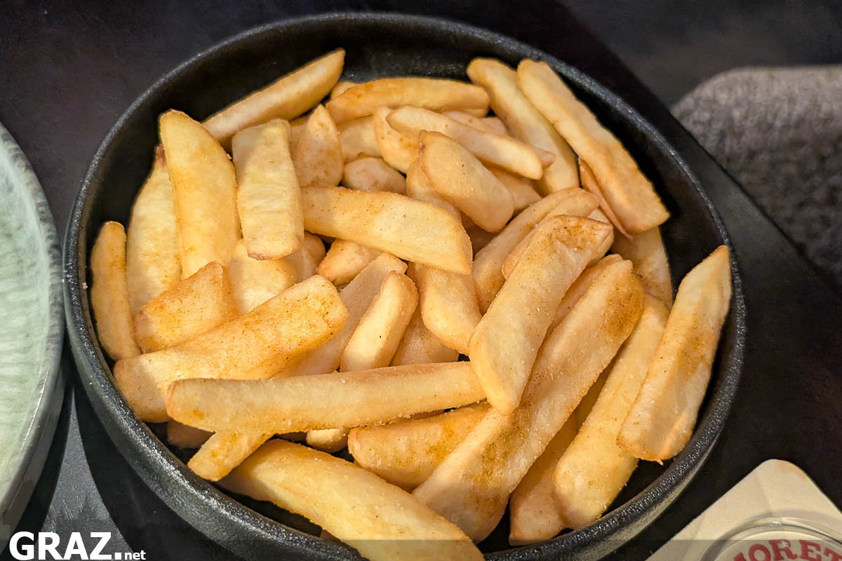 Weniger gelungen fällt der „Spicy Cheeseburger“ aus. Der Burger wirkt insgesamt etwas zu trocken und hätte von mehr Soße klar profitiert. Auch die separat zu bestellenden Steak Pommes überzeugen und nicht gänzlich. Für 6 Euro ohne Ketchup oder andere Soße ist die Beilage preislich ambitioniert, zumal sie etwas knuspriger sein dürfte. Positiv bleibt immerhin der feine Hauch Rosmarin, der den Pommes eine interessante Note gibt.