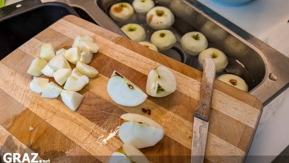 In der Zwischenzeit die Äpfel schälen, das Kerngehäuse entfernen und in Würfel schneiden. Tipp: Die geschälten Äpfel immer in eine Schüssel mit Wasser geben, die verhindert man, dass sie braun werden.