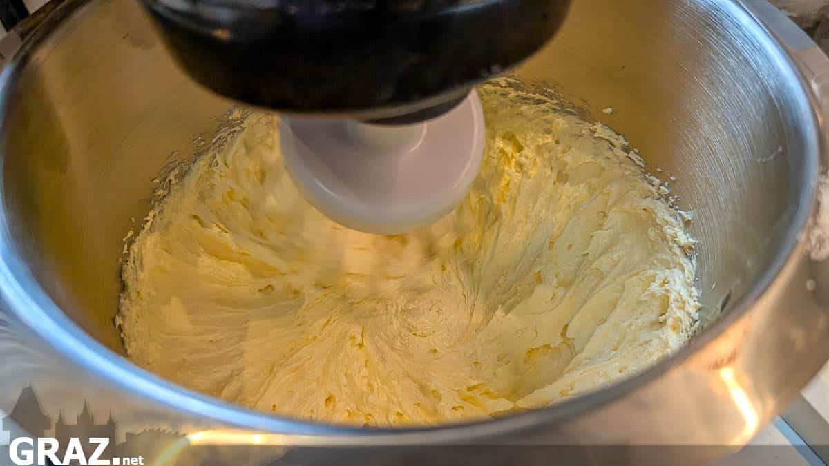 Am besten gelingt das Rezept, wenn man alle Zutaten einige Zeit vor dem Backen aus dem Kühlschrank nimmt. Wenn alle Zutaten zimmerwarm sind, wird der Butter-Abtrieb sehr schaumig und die Gefahr, dass die Masse beim Einrühren der Eidotter gerinnt, ist viel geringer.
