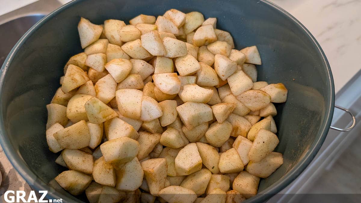 Die Äpfel mit etwas Zimt bestreuen und durchmischen. Wer es ganz süß mag, kann auch etwas Zucker hinzufügen.