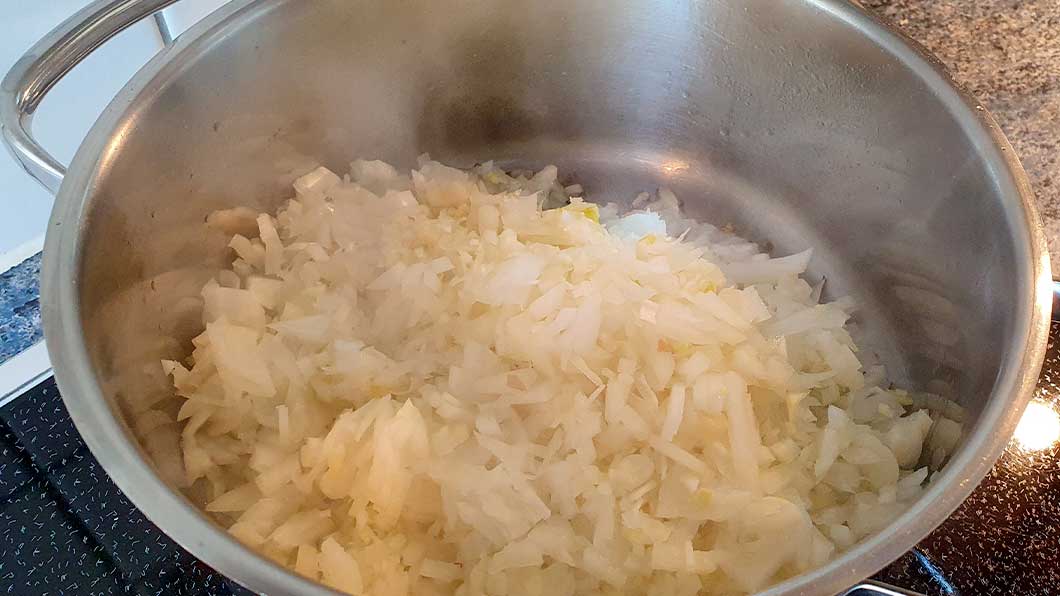 - In einem Topf wird das Öl erhitzt, die Zwiebeln darin angeröstet.