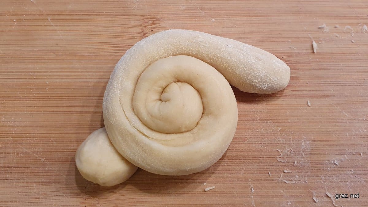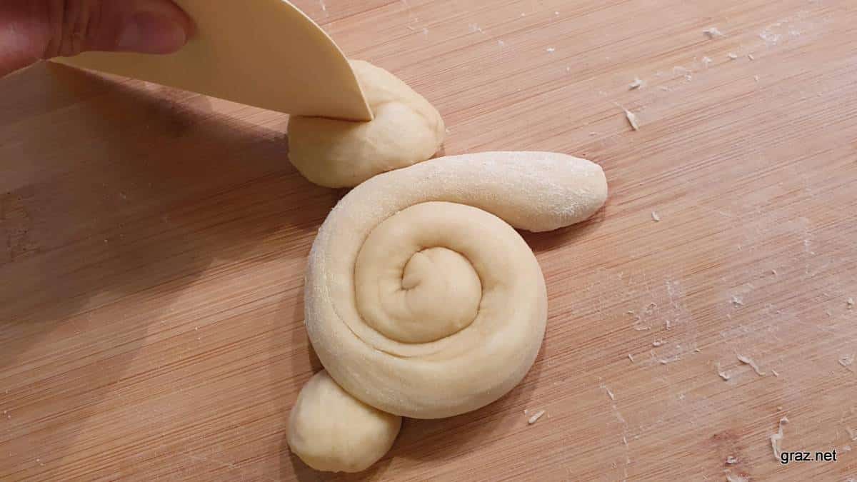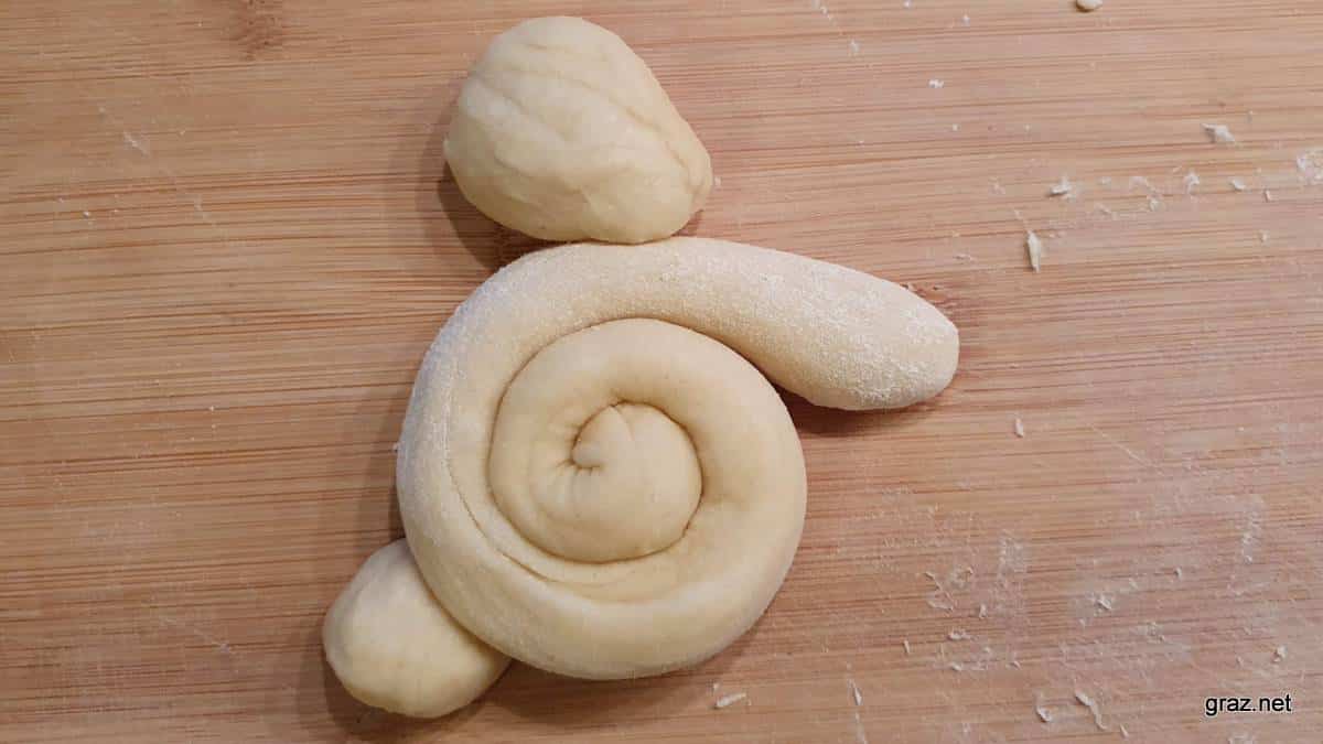 Für den Hasenkörper benötigt man einen Germteig Strang, der etwa 30 Zentimeter lang ist und einen Durchmesser von zirka einem Zentimeter hat. Der Strang wird zu einer Schnecke spiralförmig aufgerollt, das äußere Ende sollte danach etwas abstehen, das sind die Hasenpfoten.