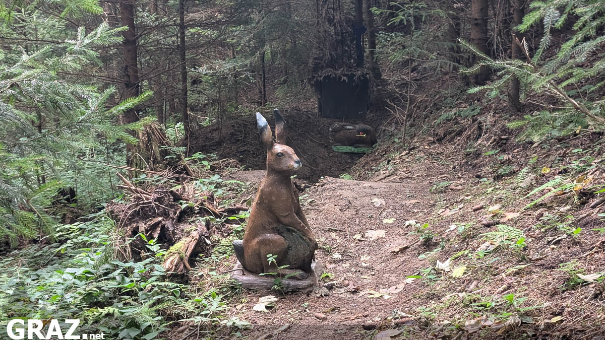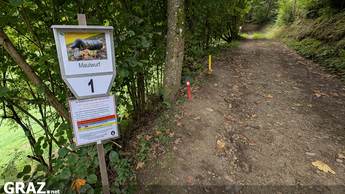 Da der ursprüngliche Parcours durch das Hochwasser 2023 in Mitleidenschaft gezogen wurde, führt der Weg nicht wie auf der Webseite angegeben auf beiden Seiten der Sulm. Der Einschussplatz ist direkt beim ersten Doppelziel am Teich. Weiter geht’s entlang des Flusses, hier sind oft Doppelziele aufgestellt, später führt der Weg auf den Hang. Zwei Pflöcke in zwei verschiedenen Distanzen stehen dem Schützen zur Verfügung. Nach Ziel 24 ist man zurück beim Teich.