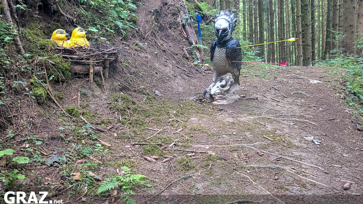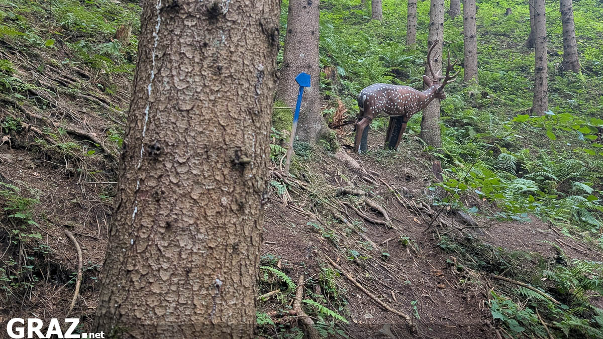 Nach einem kleinen Einschussplatz beginnt der Parcours, welcher sich etwa 4km mit 200HM durch den Wald und Teile des Weinbergs schlängelt. Vier Pflöcke stehen für den Schützen bereit: weiß für Jugend und Anfänger, blau ist WA angelehnt für geübte Schützen, rot ist für Visier- und Compound (bis 60 Pfund erlaubt) – ein zusätzlicher schwarzer Pflock ist aus „sportliche Herausforderung“ teilweise vorhanden. Die Szenarien sind toll aufgestellt, vom Simba aus König der Löwen über eine übergroße Vogelspinne im Netz bis zu verschiedensten Dinosauriern findet man im südsteirischen Wald viele lustige Ziele.