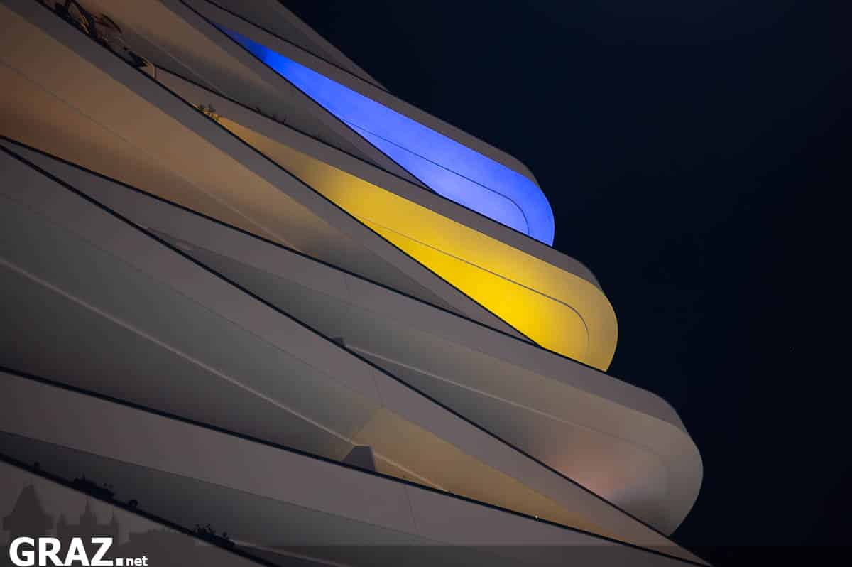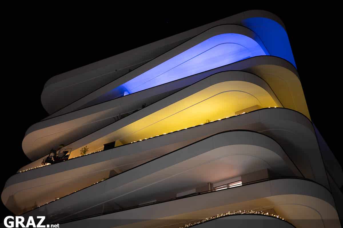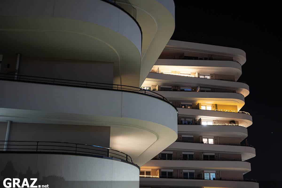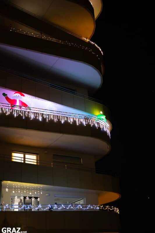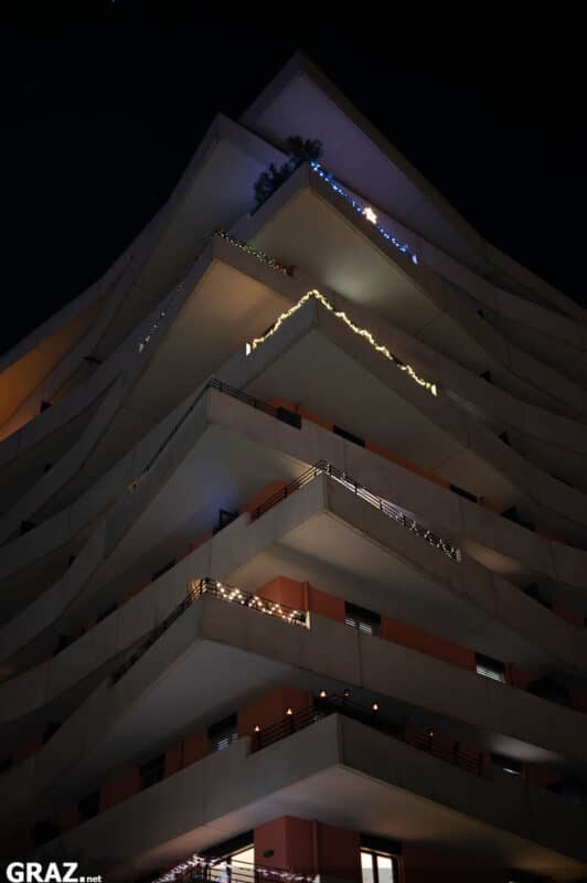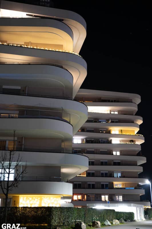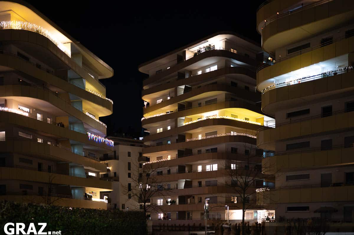 Im Advent zeigt sich die Wohnanlage Green City unterhalb des Schlosses St. Martin von einer besonders stimmungsvollen Seite. Zahlreiche Bewohner:innen haben ihre Balkone der markant gestalteten Gebäude weihnachtlich geschmückt und setzen mit warmen Lichterketten feine Akzente in der abendlichen Dunkelheit. Die runden, fließenden Linien der Architektur kommen dadurch besonders gut zur Geltung und verleihen der Anlage eine ruhige, fast poetische Atmosphäre.
