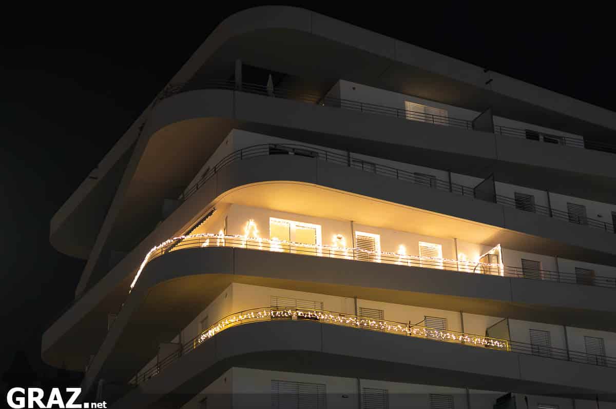 Bei einem abendlichen Fotowalk wurde diese besondere Lichtstimmung eingefangen. Die Bilder zeigen, wie sich moderne Wohnarchitektur und persönliche Gestaltung der Balkone zwischen warmweißen Lichterkette und Kitsch.